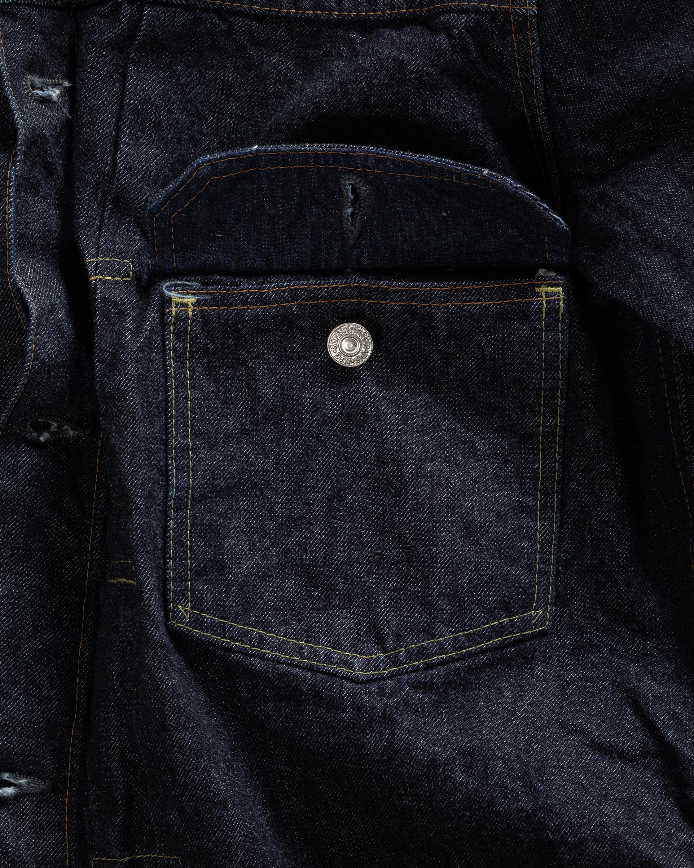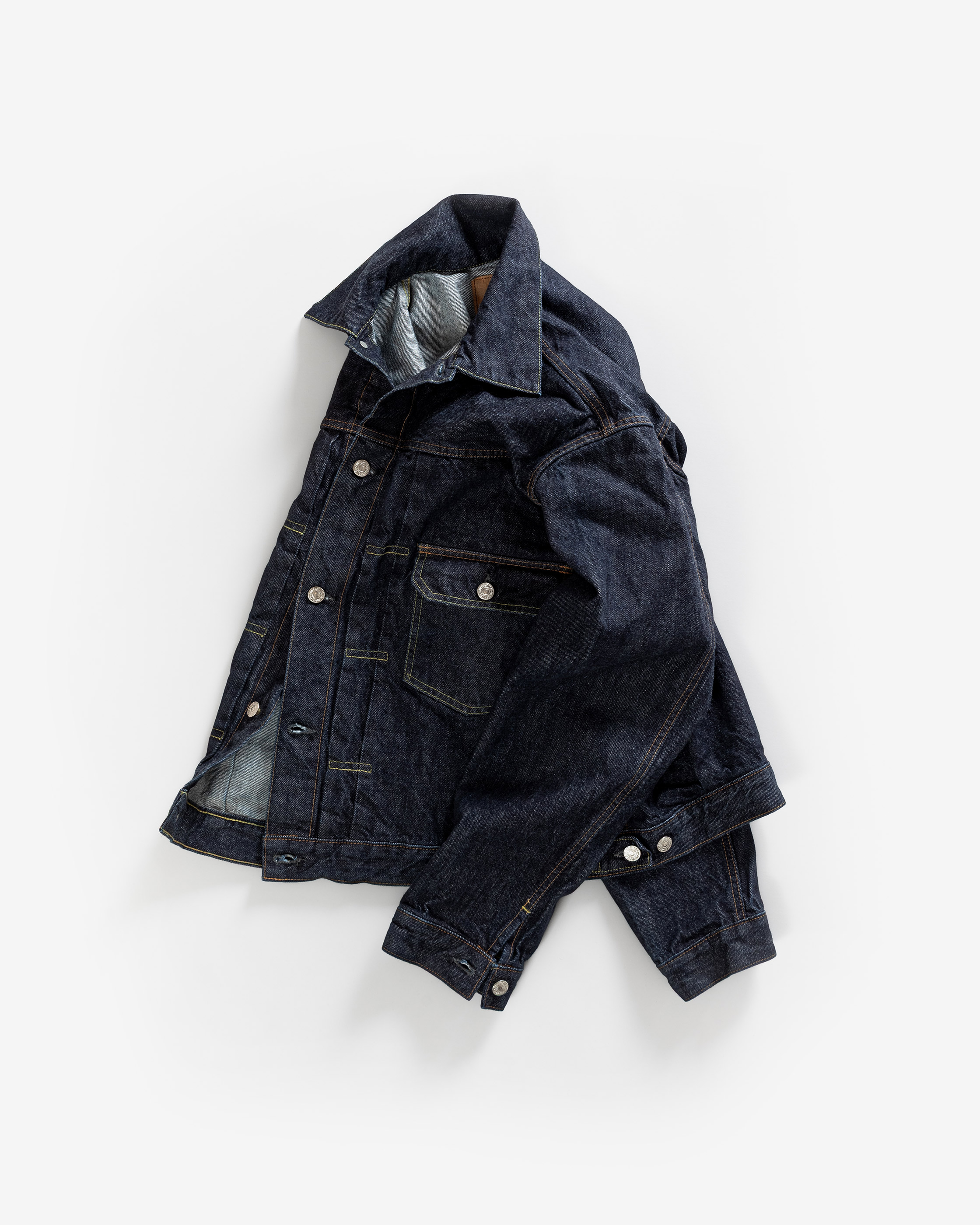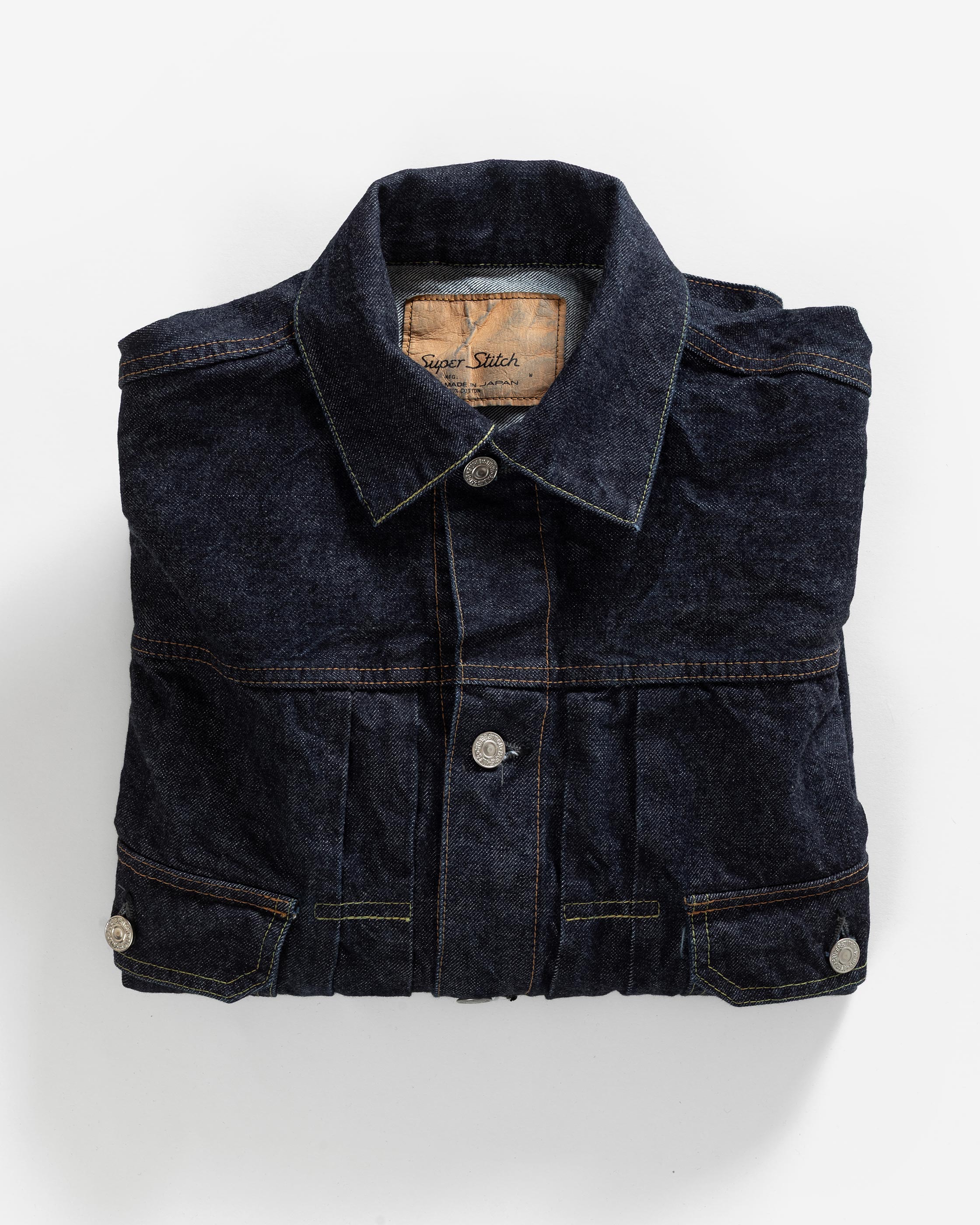 The LR11 was the first foray of Superstitch into the denim jacket category. Of the denim jackets of the period, the Type II is one of the most interesting for our founder. The iconic silhouette is created by the boxy fit on the torso, dropped shoulders and front knife pleats. We wanted to revive the Type II in every way as close as possible to the original, not only in its look but also its feel. The meticulous research and development of this product took one year.