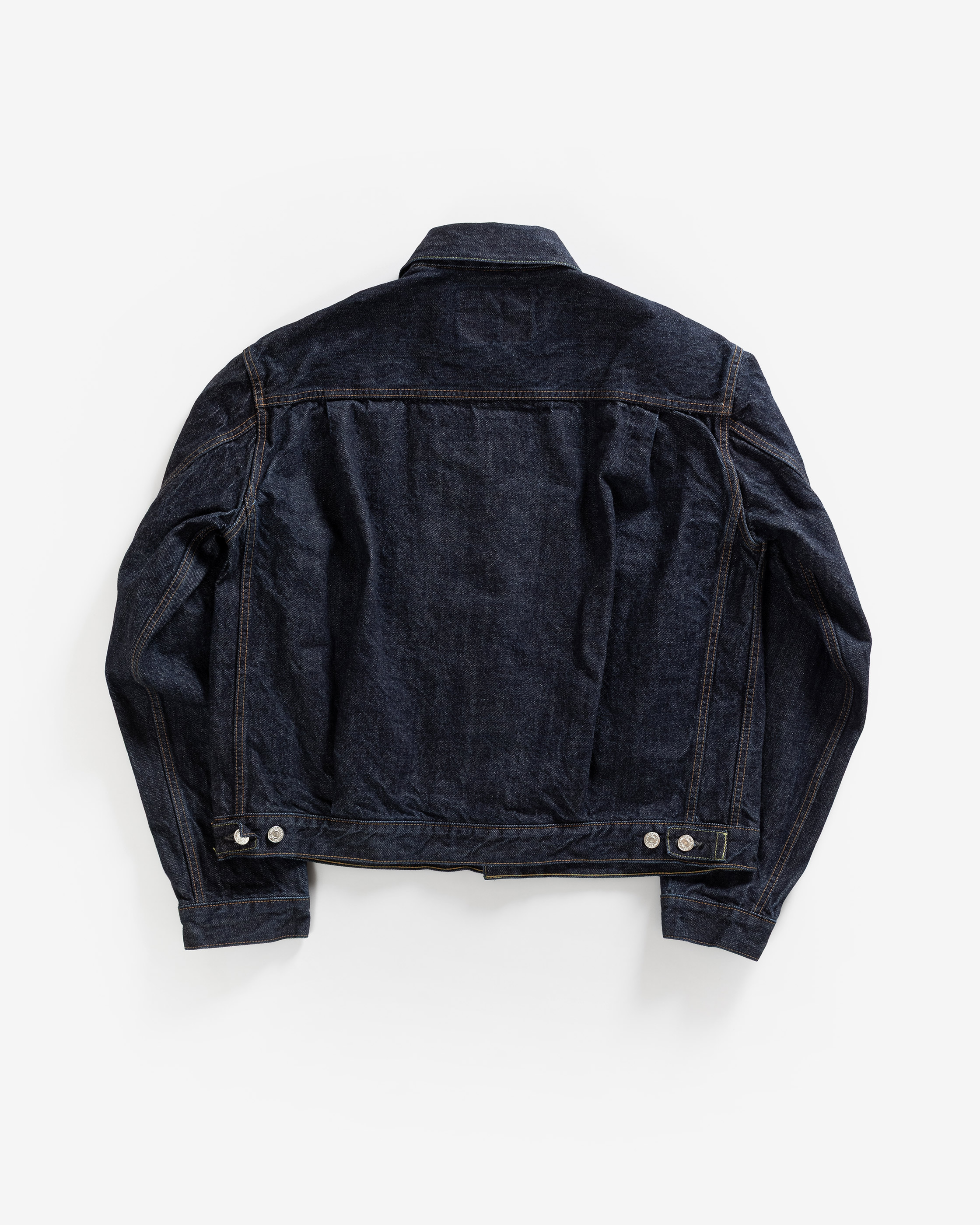 To achieve the signature volume of the Type II jacket, every element of construction was meticulously respected, from the knife pleated front originally designed to give ease of movement, to the button side waist adjusters that contribute to the jacket’s signature silhouette. The details observed go as far as the pocket flaps that are lined in 6oz dungaree in natural indigo, rather than doubling in the same fabric, just like the original, allowing for the pocket flap to be soft and pliable. Some liberties were taken such as the addition of back side panels – these in the period were only featured on larger sizes where the fabric rolls were not wide enough for the back portion to be cut in a single piece. We made this design choice to express the signature elements of this jacket in all sizes, and also adding another point of interest as the jacket ages and fades.