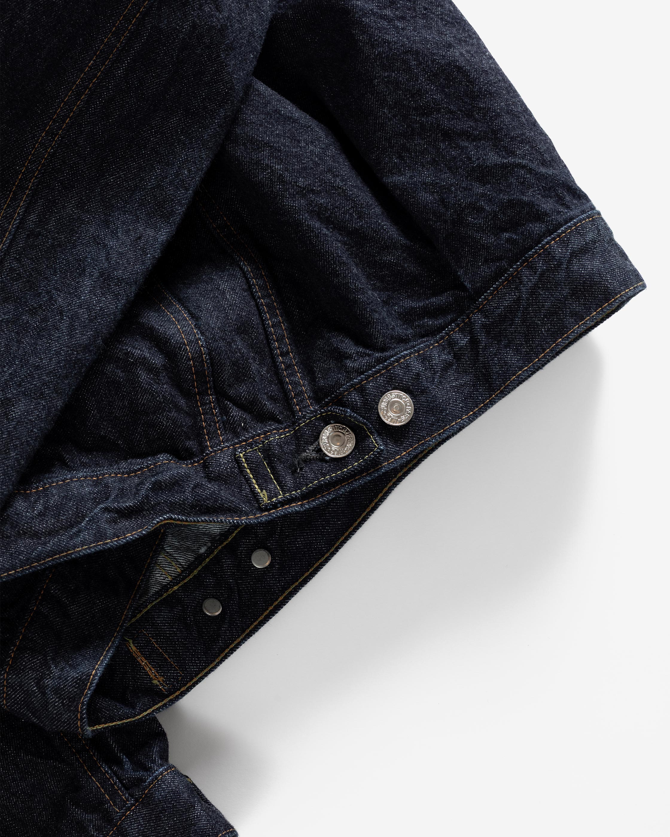 As for the threads, for which we faithfully selected 100% cotton as per the period. But due to being more fragile than polyester thread, the thickness had to be considered carefully for different areas of the jacket, addressing the varying amount of expected wear and tear. Here also was one subtle variation – the two tones of the threads were inverted as opposed to the original Type II, and for the bartack on the pocket corners, we chose a fresh lemon yellow to add a pleasing contrast.