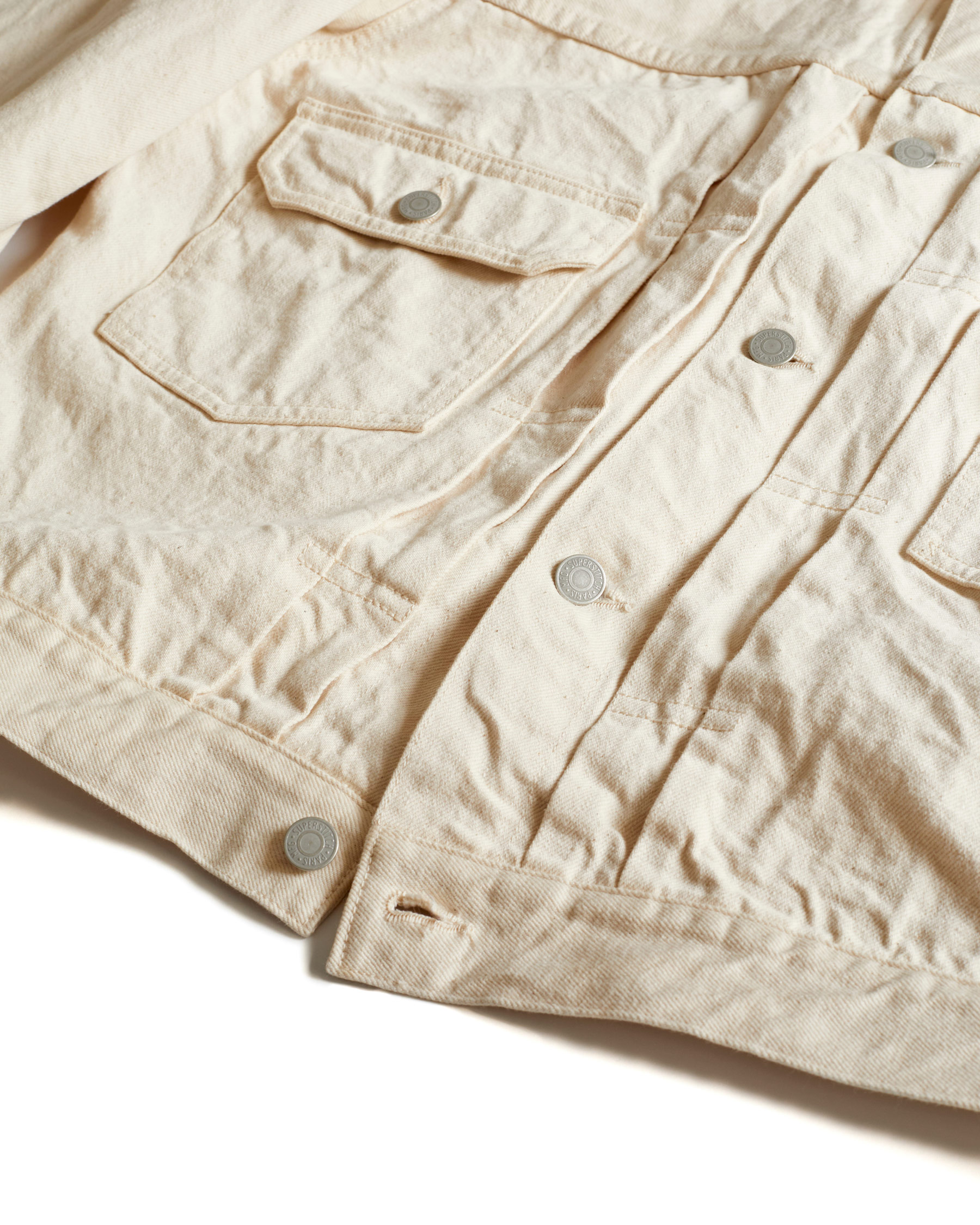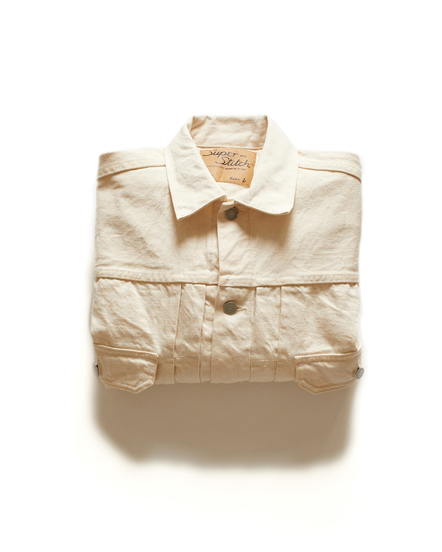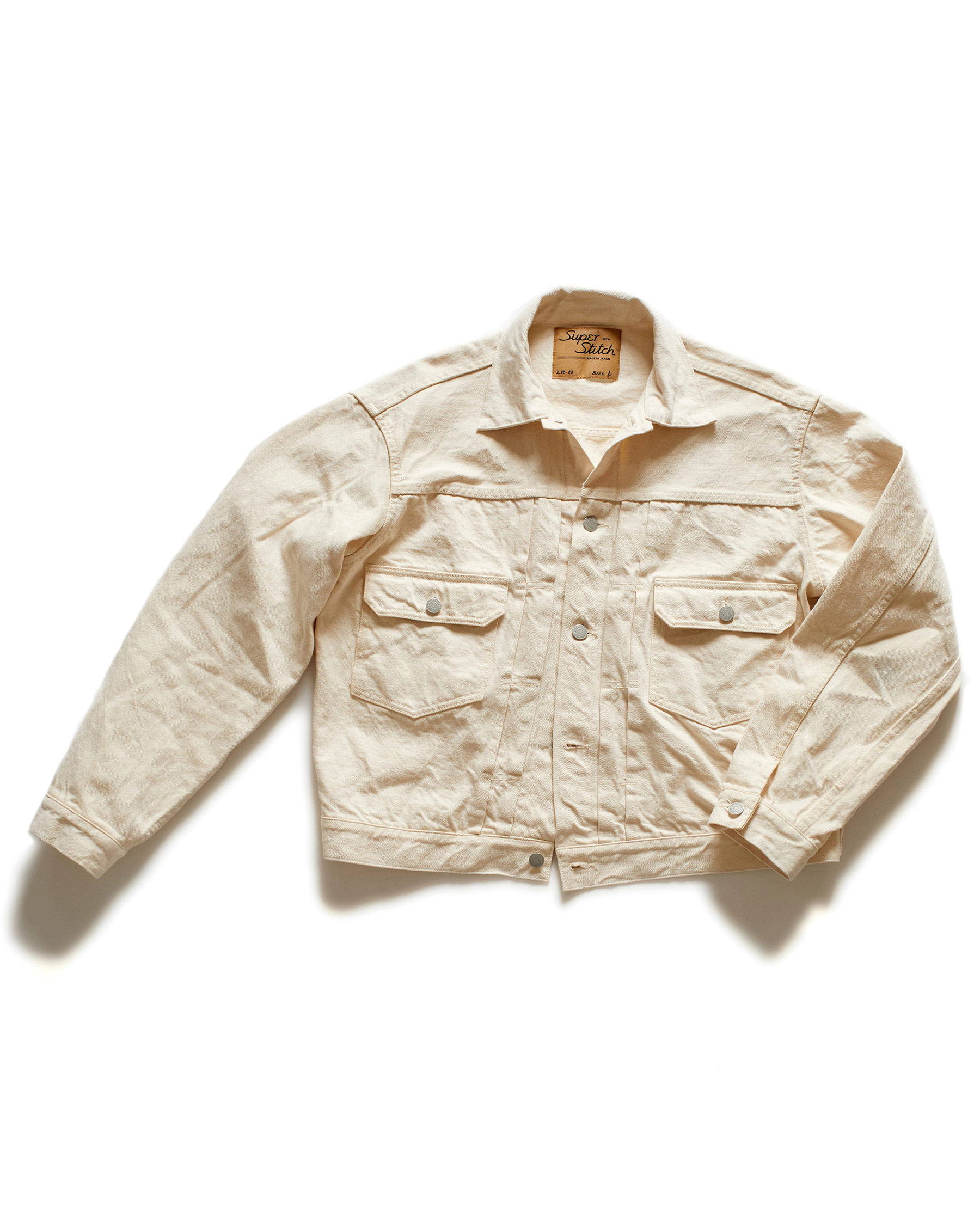 The LR11 was the first foray of Superstitch into the denim jacket category. Of the denim jackets of the period, the Type II is one of the most interesting for our founder. The iconic silhouette is created by the boxy fit on the torso, dropped shoulders and front knife pleats. We wanted to revive the Type II in every way as close as possible to the original, not only in its look but also its feel. The meticulous research and development of this product took one year.
