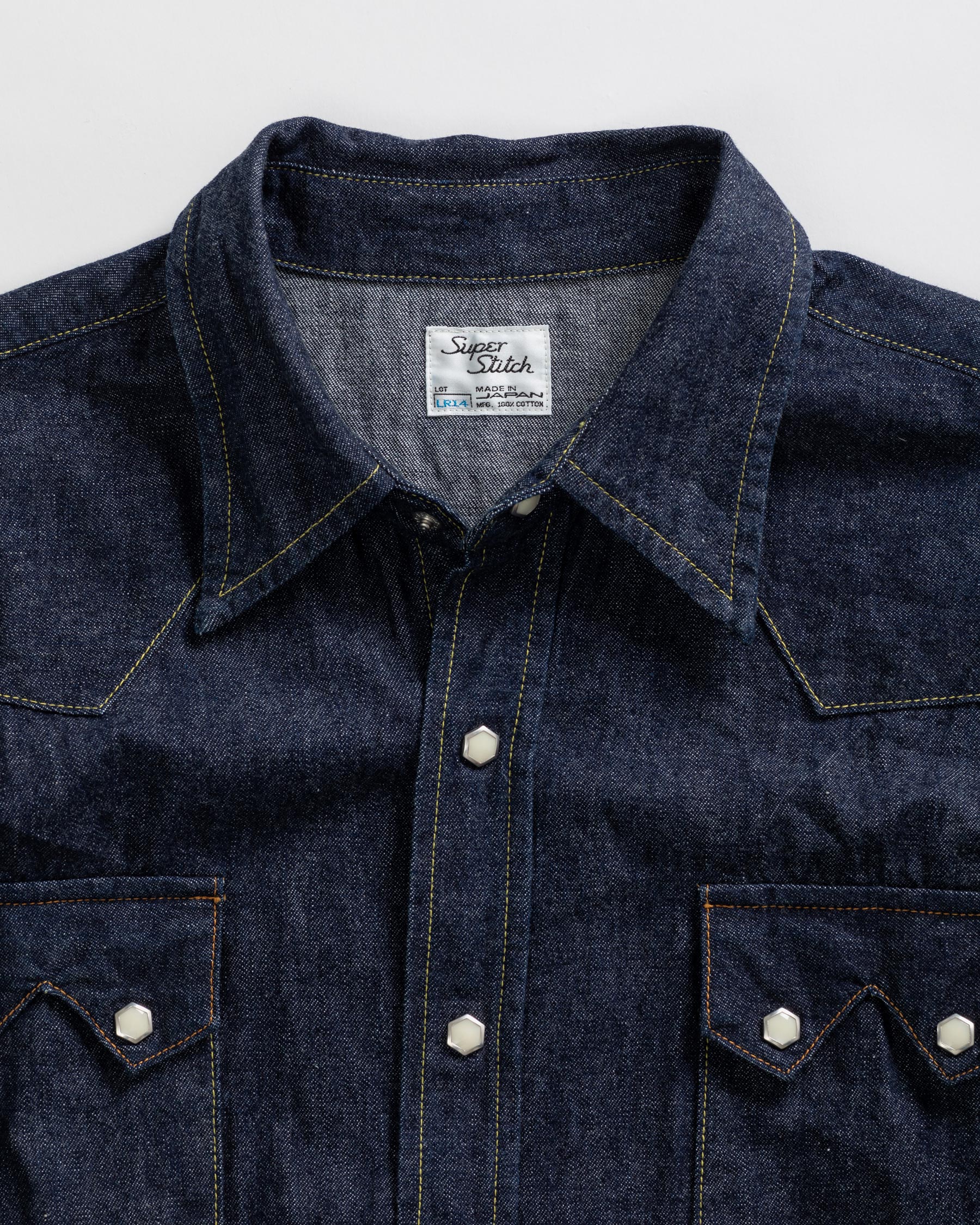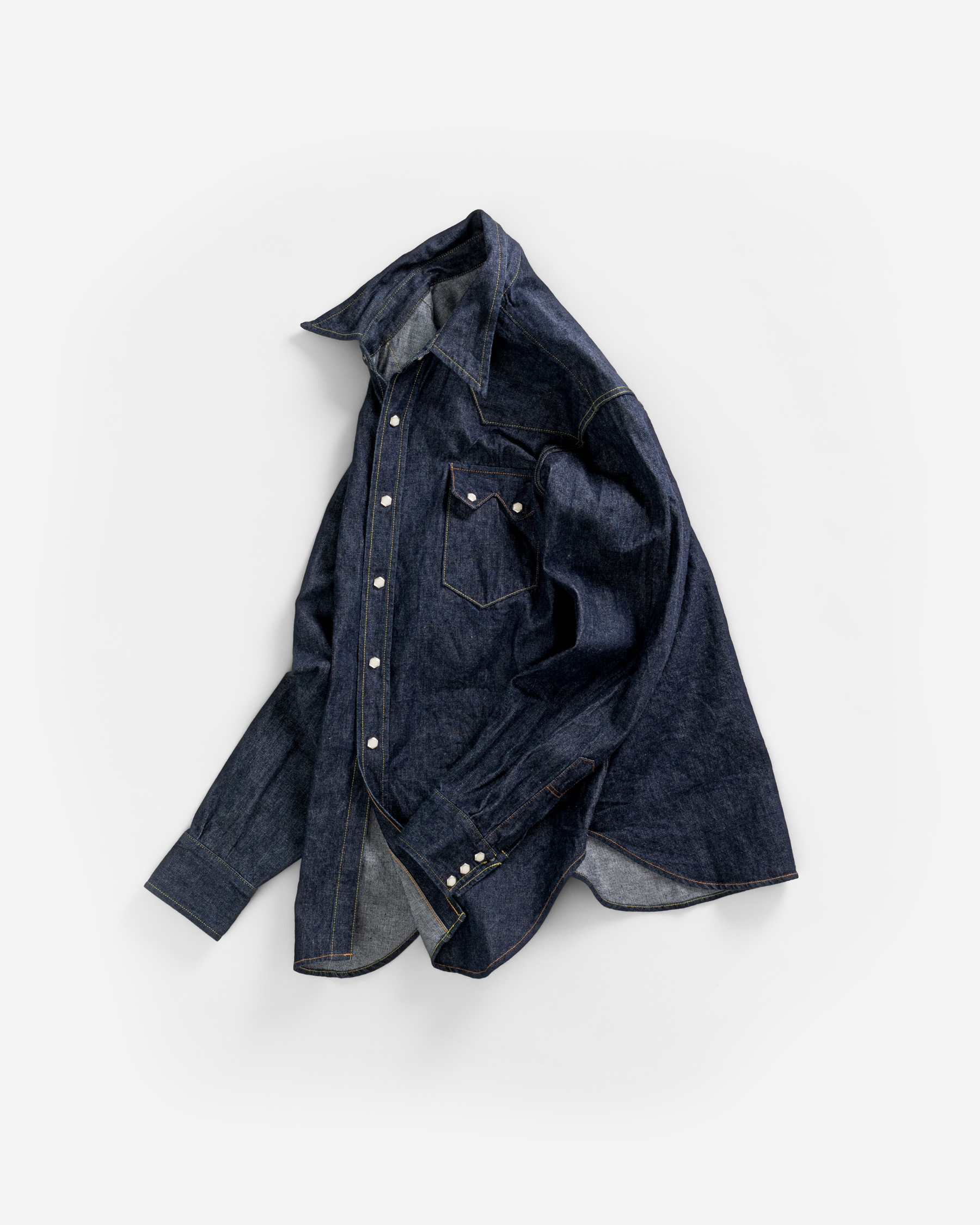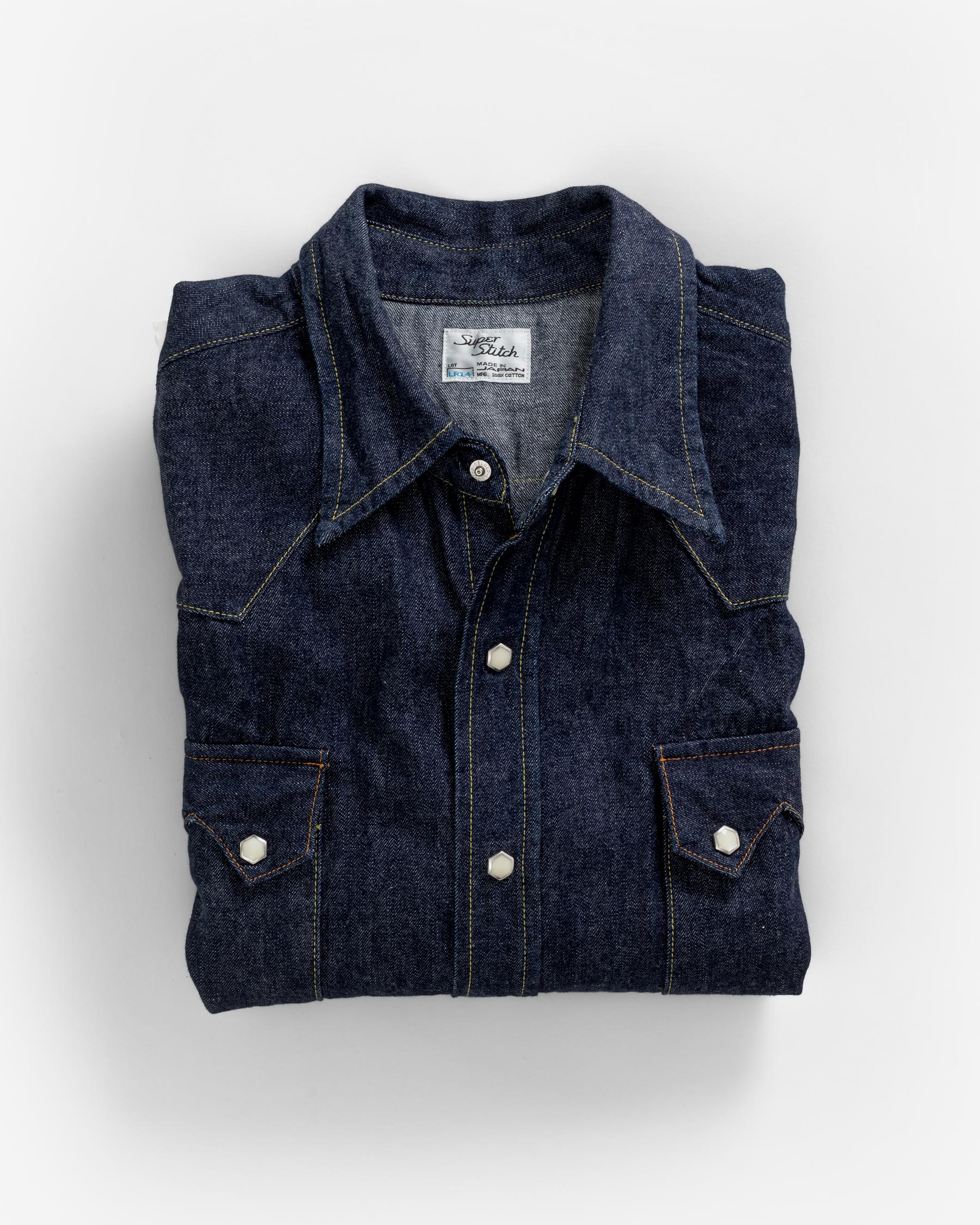 The LR14 is the brand’s first denim shirt, and the second shirt introduced to our shirt repertoire, joining the LR12 Chambray shirt. The 1950s western shirt was nicknamed the ‘sawtooth shirt’ because of its pointed pockets that resembled the teeth of a saw. Though this was the inspiration for the LR14, the precise inspiration was not the most widely familiar version of the western denim shirt – the one with single pointed pocket flaps – but rather, the point of departure was the original double pointed pocket flap iteration of the ‘sawtooth’ that came before. Though it is the single pointed pocket that became archetypal for the western shirt, paradoxically, for our founder, it’s the two pointed pockets that make the shirt more modern for today.