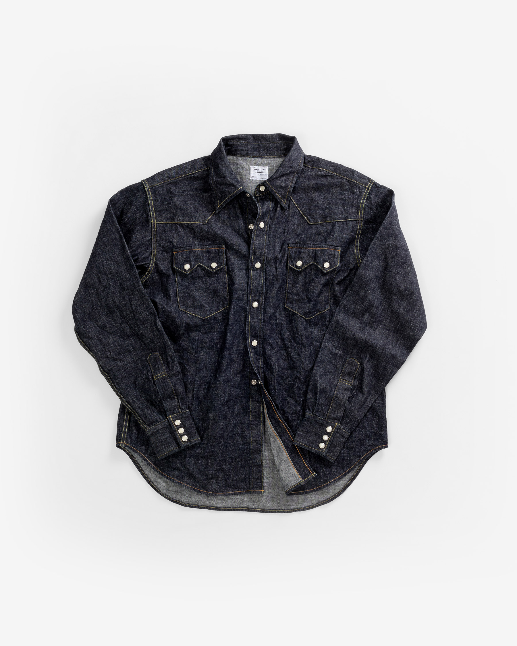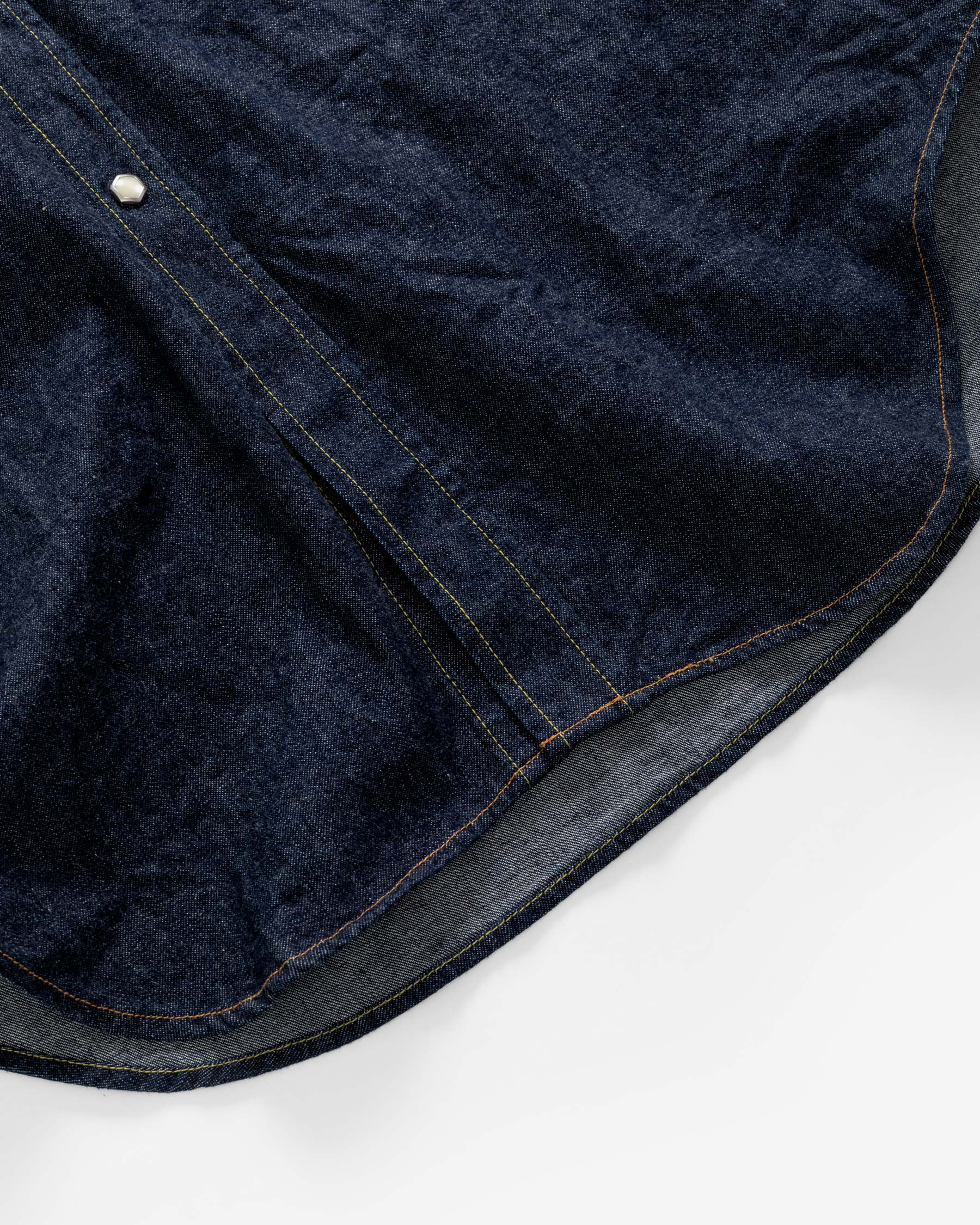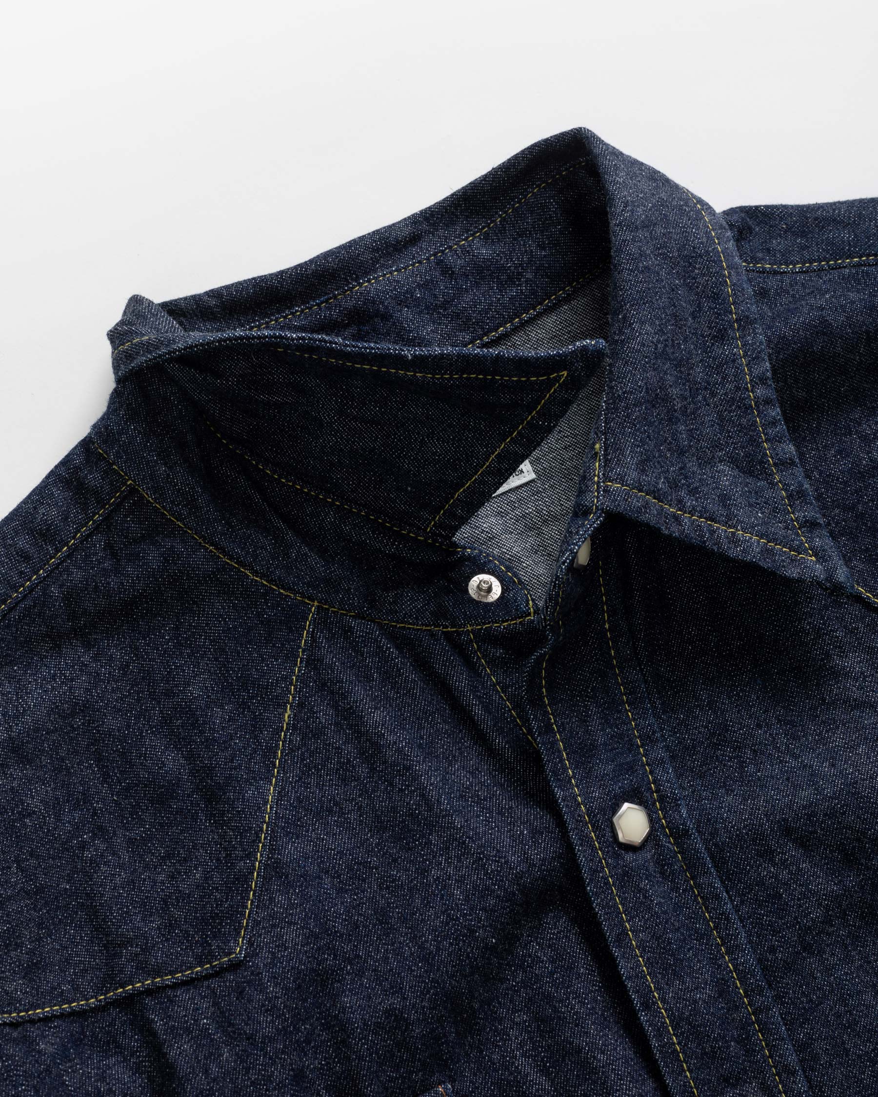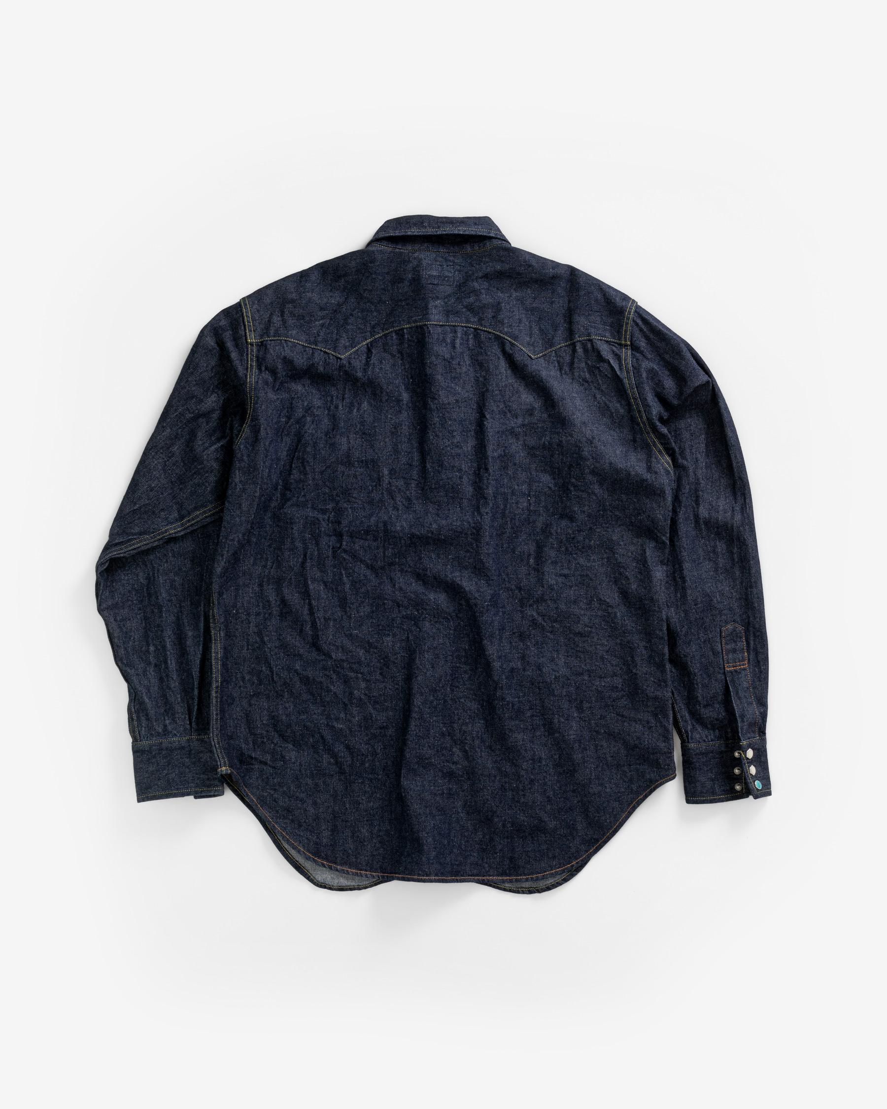 The LR14 is the brand’s first denim shirt, and the second shirt introduced to our shirt repertoire, joining the LR12 Chambray shirt. The 1950s western shirt was nicknamed the ‘sawtooth shirt’ because of its pointed pockets that resembled the teeth of a saw. Though this was the inspiration for the LR14, the precise inspiration was not the most widely familiar version of the western denim shirt – the one with single pointed pocket flaps – but rather, the point of departure was the original double pointed pocket flap iteration of the ‘sawtooth’ that came before. Though it is the single pointed pocket that became archetypal for the western shirt, paradoxically, for our founder, it’s the two pointed pockets that make the shirt more modern for today.
