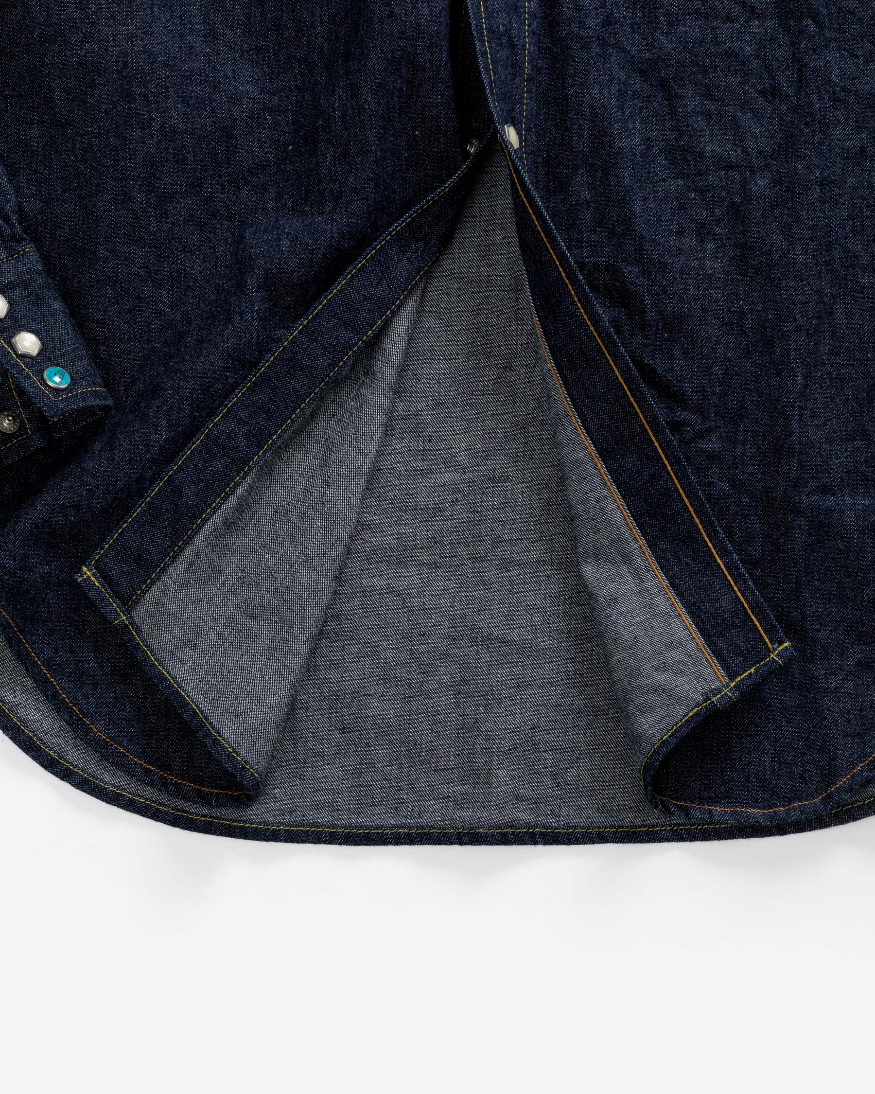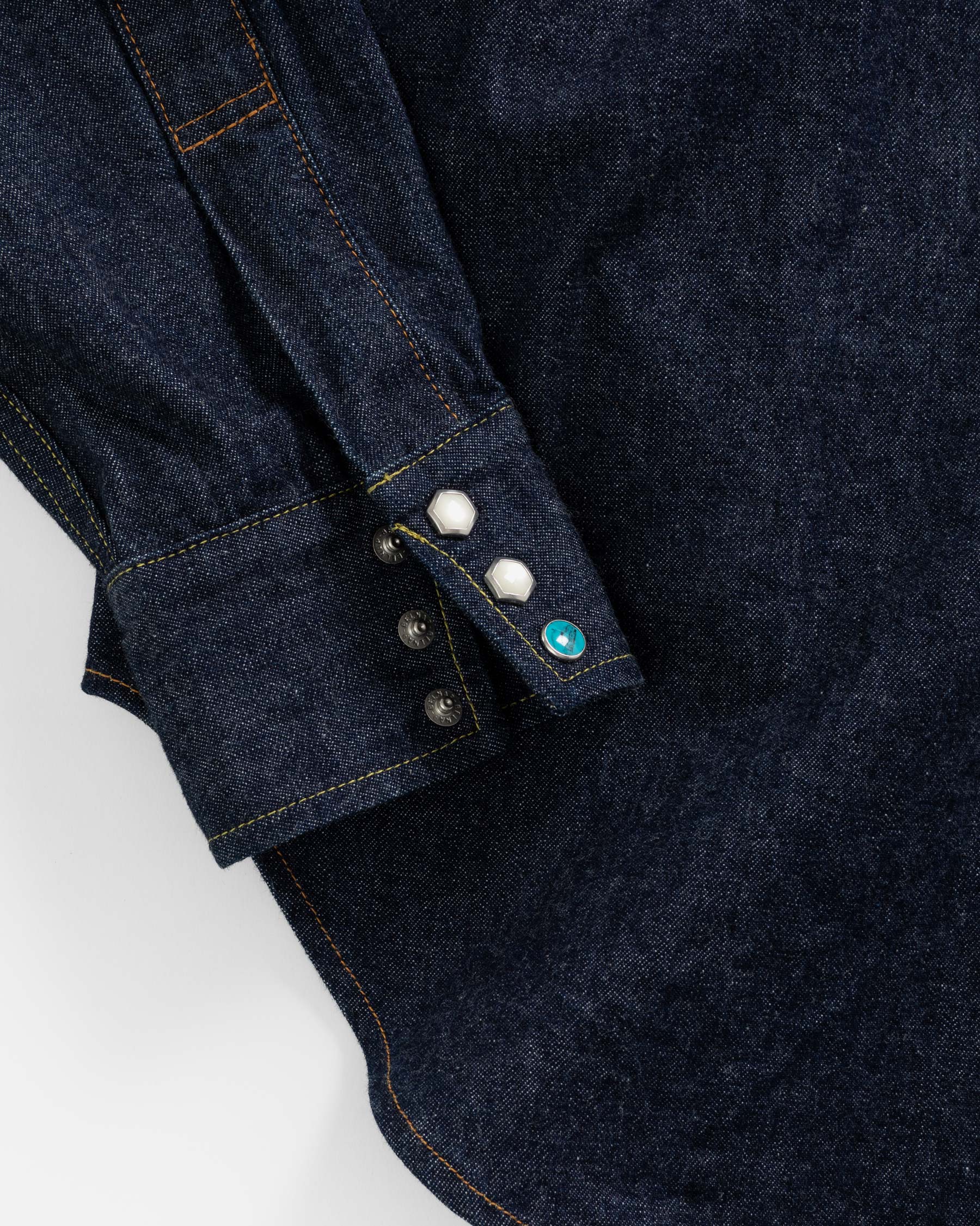 It’s the details that make the LR14 special, including the two-pointed yoke panels on the front and back of the shirt, the pointed collar, and the long and curved shirt tails.The silver framed mother-of-pearl octagonal buttons are a key variation on the round buttons characteristic of the period, chosen by our founder because the shape evokes octagonal headed bolts – a reference to the brand’s roots in a love of mechanics. These buttons are used throughout, with one exception: one contrasting round turquoise snap button is randomly placed on each cuff. The LR14 is assembled with 100% cotton thread in contrasting tones, which fade beautifully with wear, wash and sun exposure.